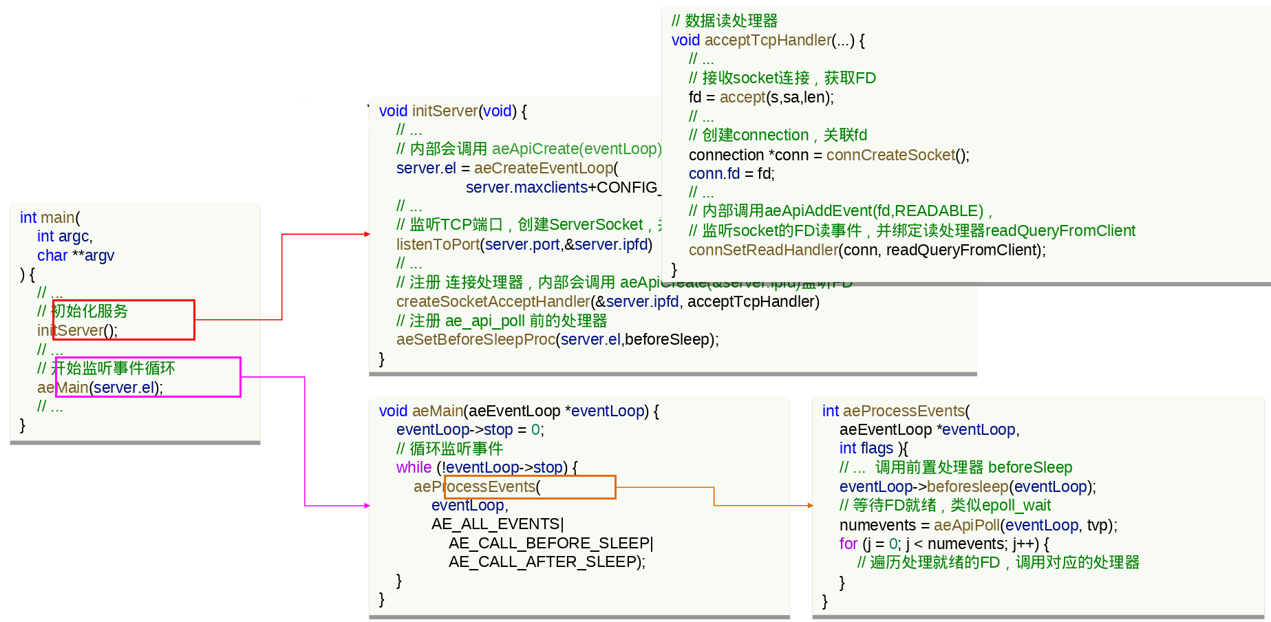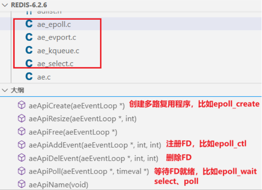 - Redis通过IO多路复用来提高网络性能,并且支持各种不同的多路复用实现,并且将这些实现进行封装, 提供了统一的高性能事件库API库 AE: