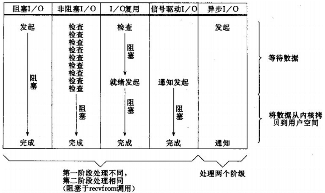 - 在《UNIX网络编程》一书中,总结归纳了5种IO模型: