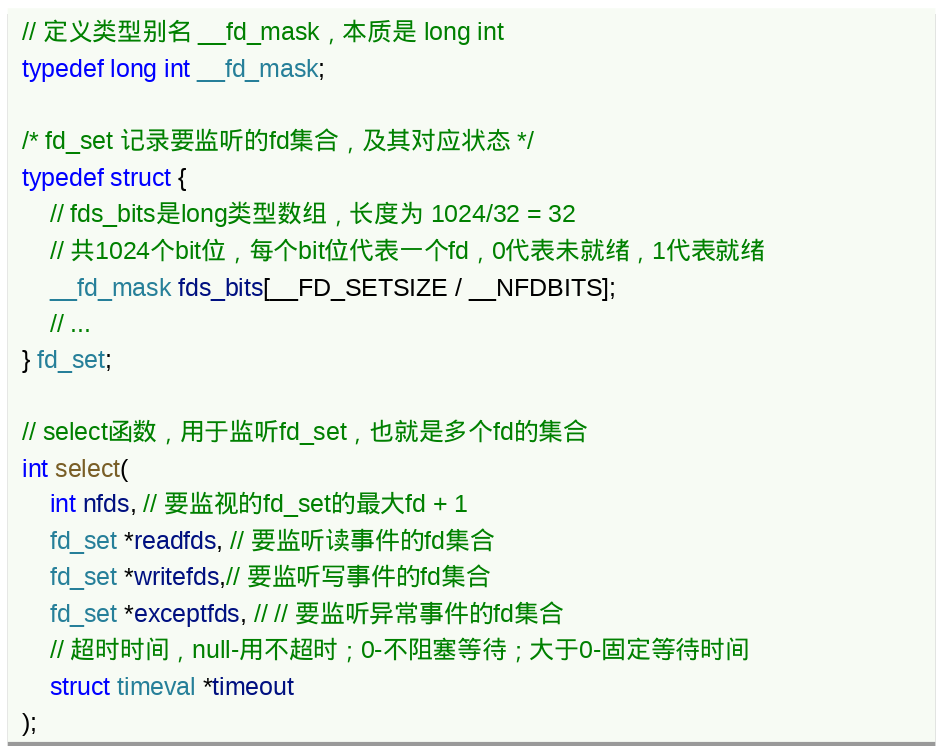 - select无法得知具体是哪个fd就绪,需要遍历整个fd_set