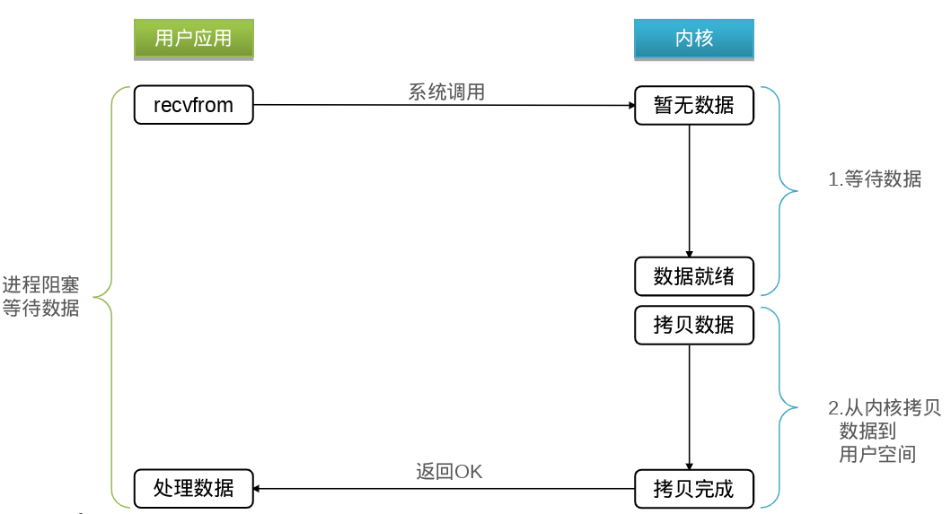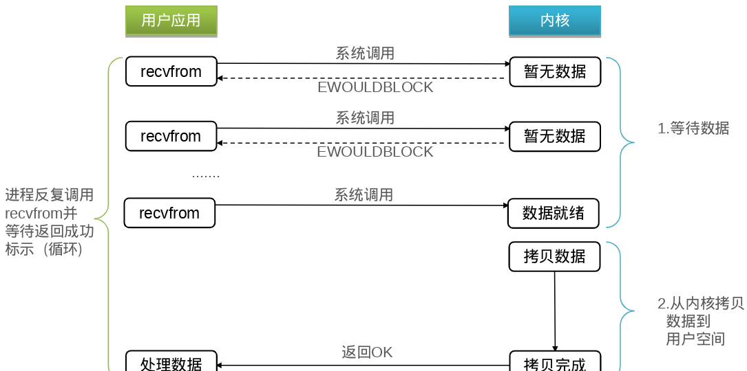 - 无论是阻塞IO还是非阻塞IO,用户应用在一阶段都需要调用recvfrom来获取数据,差别在于无数据时的处理方案: