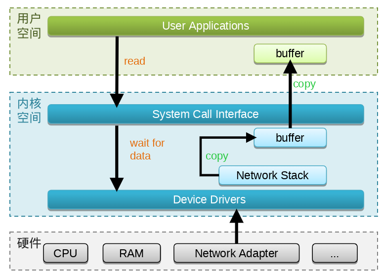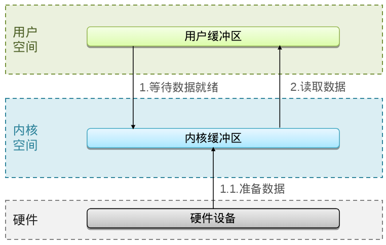 - 读数据时,要从设备读取数据到内核缓冲区,然后拷贝到用户缓冲区