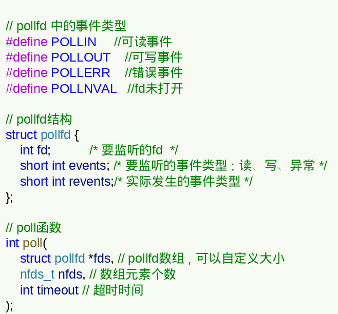 - poll模式对select模式做了简单改进,但性能提升不明显,poll利用链表解决了select中监听FD上限的问题,但依然要遍历所有FD,如果监听较多,性能会下降,部分关键代码如下: