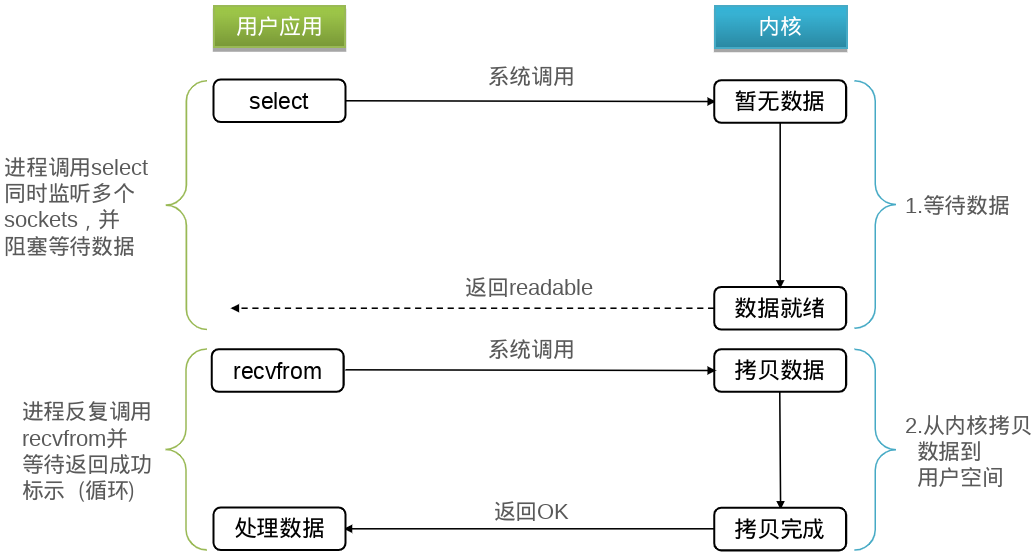 - 那么问题来了:用户进程如何知道内核中数据是否就绪呢?答案是IO多路复用