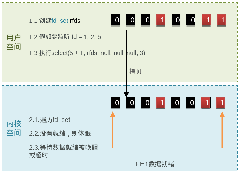 - 需要将整个fd_set从用户空间拷贝到内核空间,select结束还要再次拷贝回用户空间