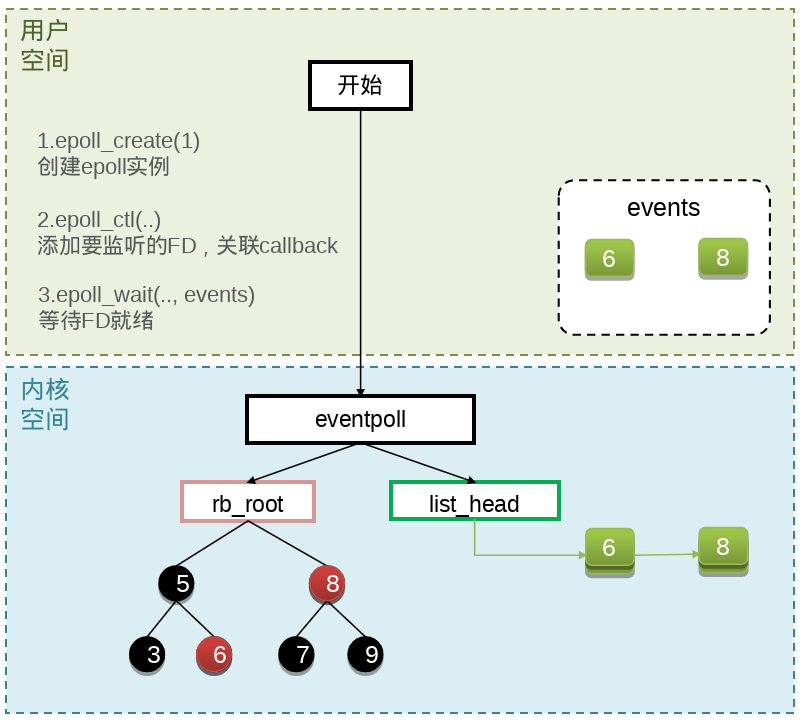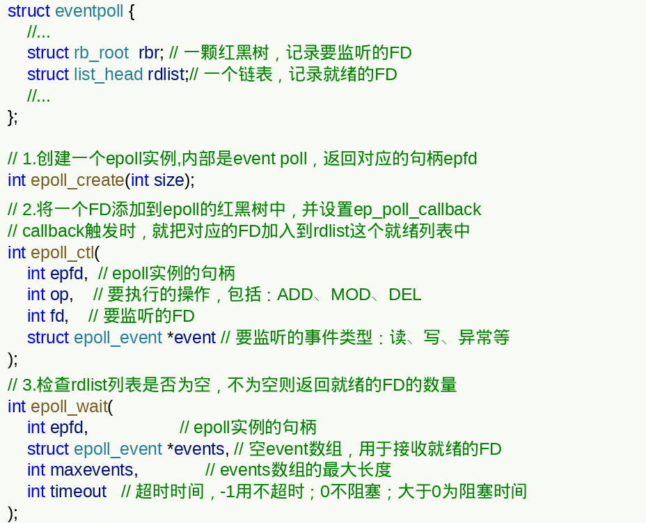 - 每个FD只需要执行一次epoll_ctl添加到红黑树,以后每次epol_wait无需传递任何参数,无需重复拷贝FD到内核空间