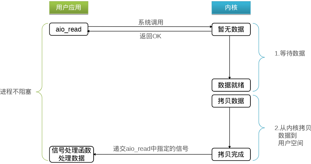- 拷贝完成,内核递交信号触发aio_read中的回调函数