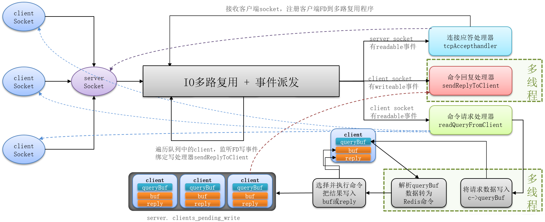 - Redis 6.0版本中引入了多线程,目的是为了提高IO读写效率。因此在解析客户端命令、写响应结果时采用了多线程。核心的命令执行、IO多路复用模块依然是由主线程执行。