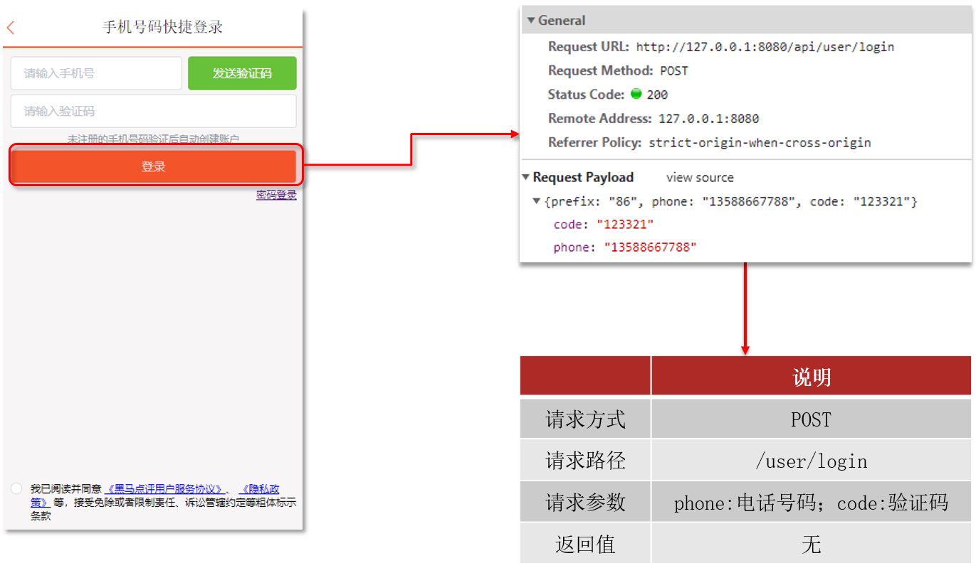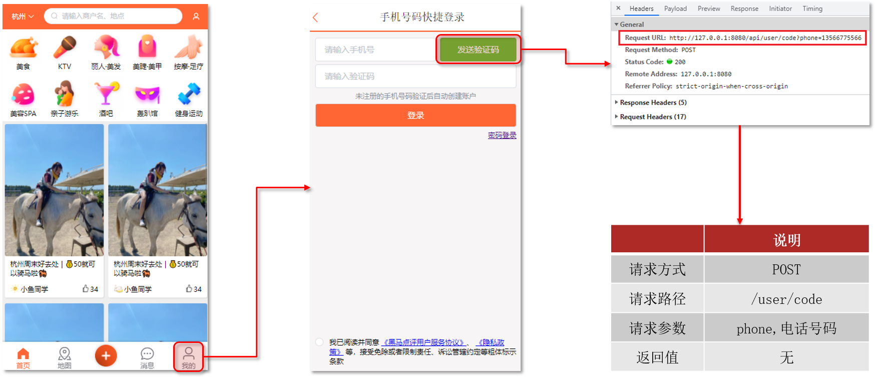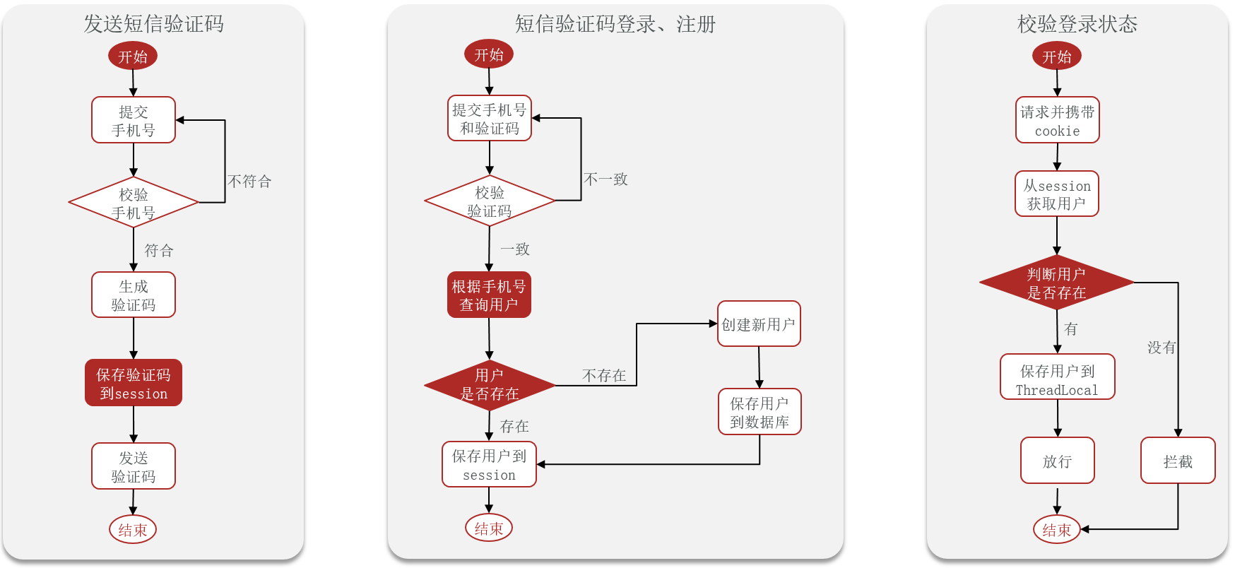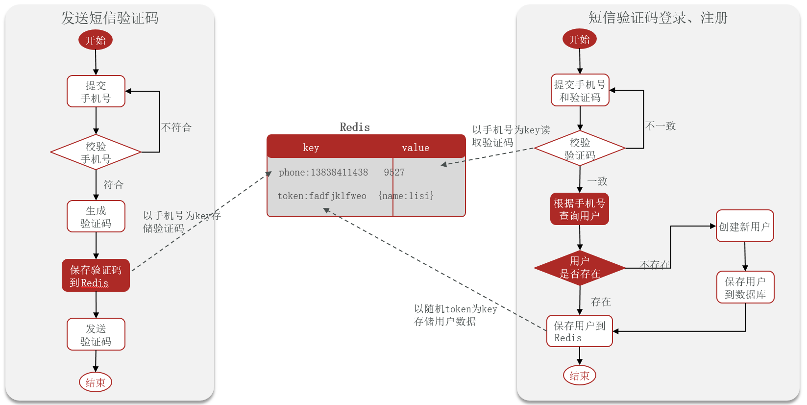 **短信验证码登录、注册:**用户将验证码和手机号进行输入,后台从session中拿到当前验证码,然后和用户输入的验证码进行校验。