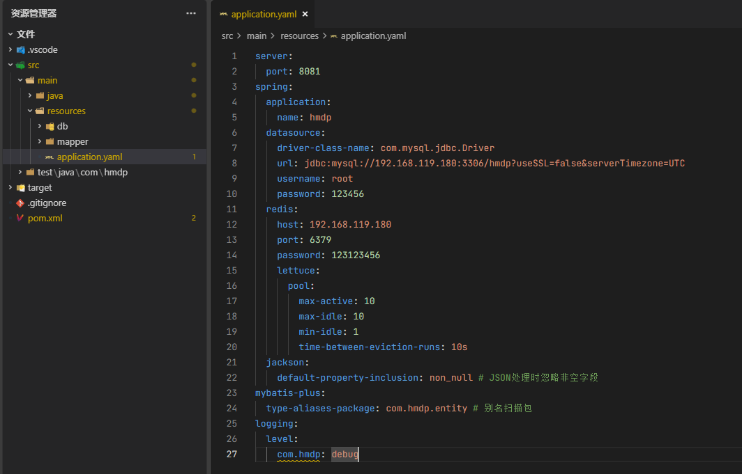 使用IDEA打开项目,修改application.yaml文件中的mysql、redis地址信息