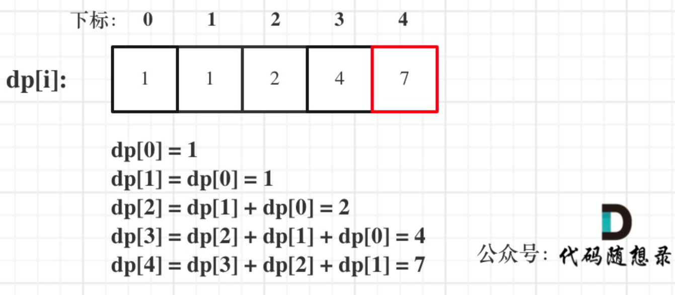 求装满背包有多少种方法的递推公式是:dp[j] = dp[j] + dp[j - nums[i]],这里的阶梯数从 1 ~ m,dp[i] 的来源也是这些,所以递推公式:dp[j] = dp[j] + dp[j - i];