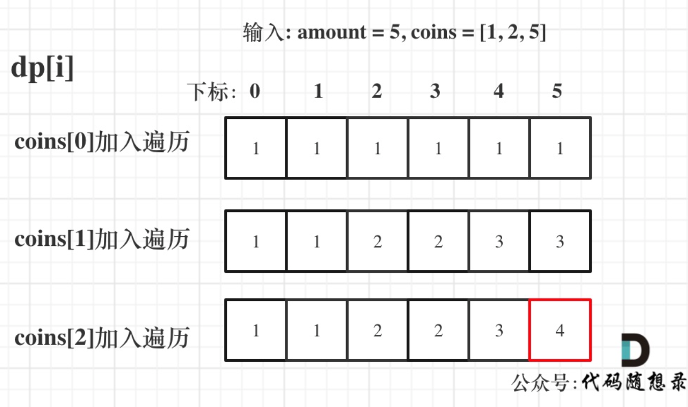 在求 目标和 的那道题中,求装满背包有几种方法,这里也是求总金额凑成 amount 的方法数,所以这里的递推公式为:dp[j] = dp[j] + dp[j - coins[i]];