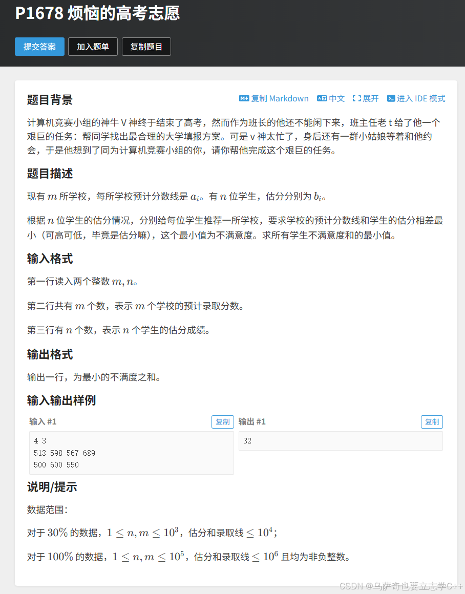 一、首先可以利用set存储所有学校的录取分数线,然后遍历所有学生分数并用lower_bound找到大于等于特定学生分数b的最小值的下标,将该下标减一就得到了小于等于b的最大值,然后比较这两个值哪个离b最近,并把差值加到ret中。