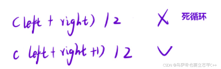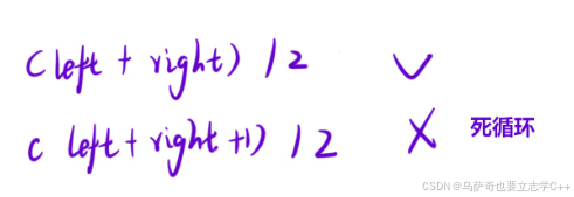 我们知道目标在右半部分,所以当序列为偶数个时如果取靠右哪个区间中点,当mid为靠右哪个区间中点时,接下来的逻辑是right = mid,这时无论while循环条件是 left < right 还是 left <= right 都会一直死循环,因为left和right永远不会重合。