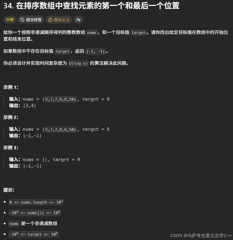 3、二分结束后,相遇点的情况:二分循环结束后正常情况下相遇点就是最终结果,但是不排除有例外情况比如整个区间中根本没有目标元素,例如(0、0、3、3),所以需要判断一下相遇点是否是我们想要的结果。