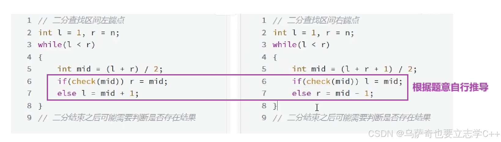 - 上面两个模板代码是配套使用的,不⽤死记硬背,算法原理搞清楚之后,在分析题⽬的时候⾃然⽽然就知道要怎么写⼆分的代码,小编再啰嗦一点,if/else中的判断条件是mid落在两个区间(目标值可能所在区间和不存在目标值区间)的哪个区间。