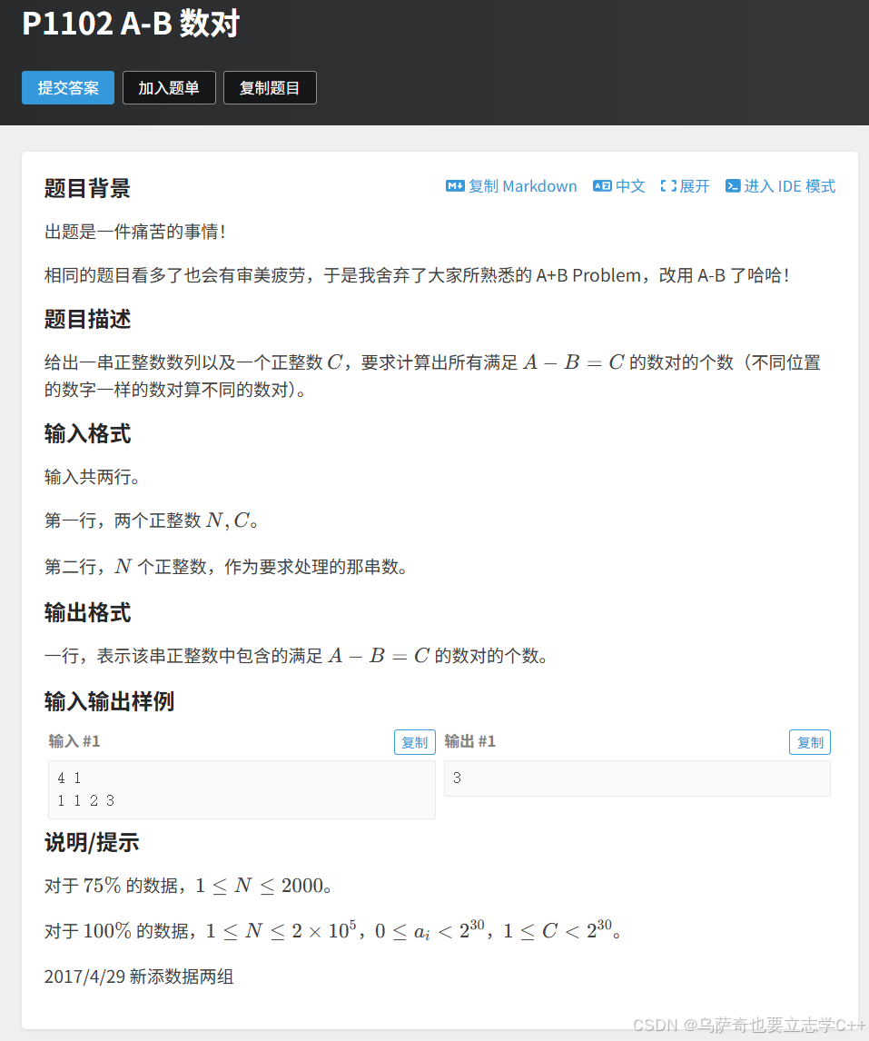 因为本题的序列是无序的,所以我们可以把它拍成有序,排成有序后遍历整个有序数组,把遍历到的元素当作b,然后找b对应的a个数(a = b + c),找a的个数就相当于找a区间的长度,因为序列有序,所以可以用二分查找a区间的长度。