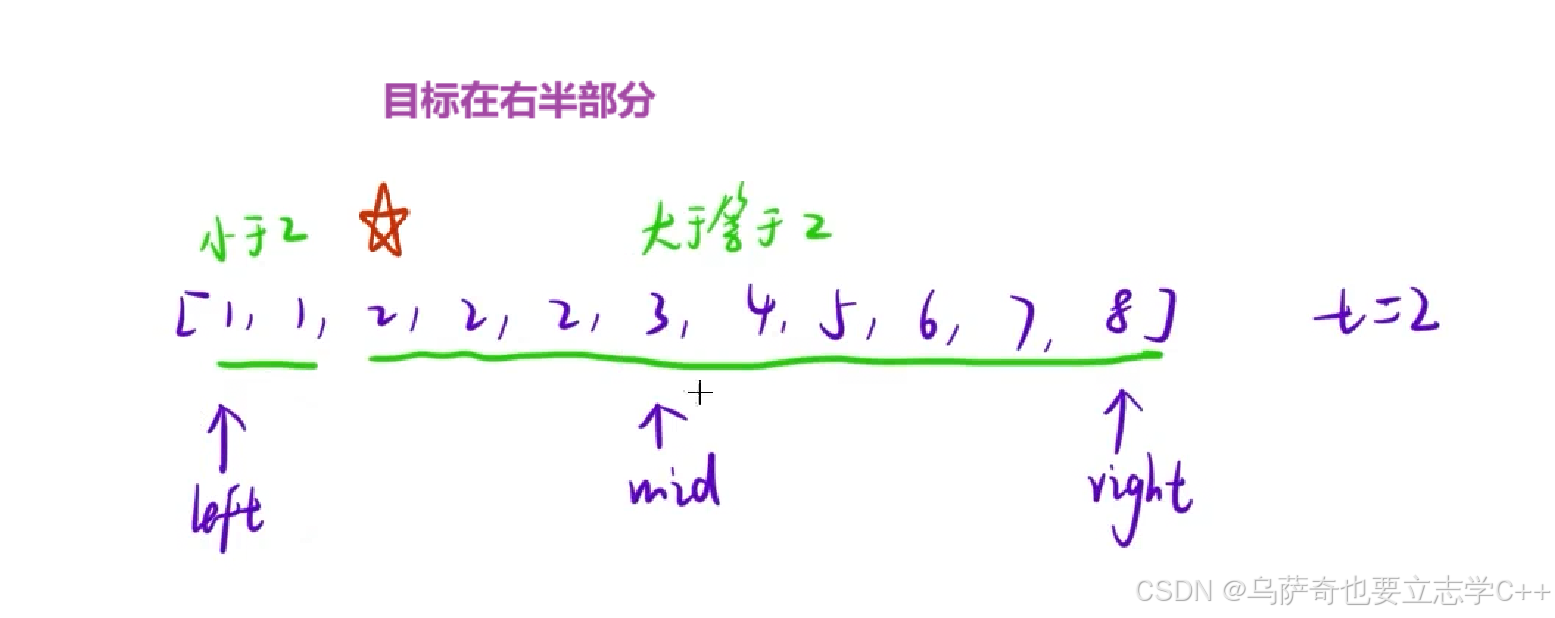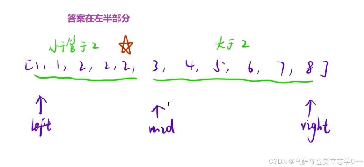 因为本题数组是不递减的,所以具有二段性,在序列中选中某个值后在该值的左边的元素一定小于等于该值,在该值的右边的元素一定大于等于该值。