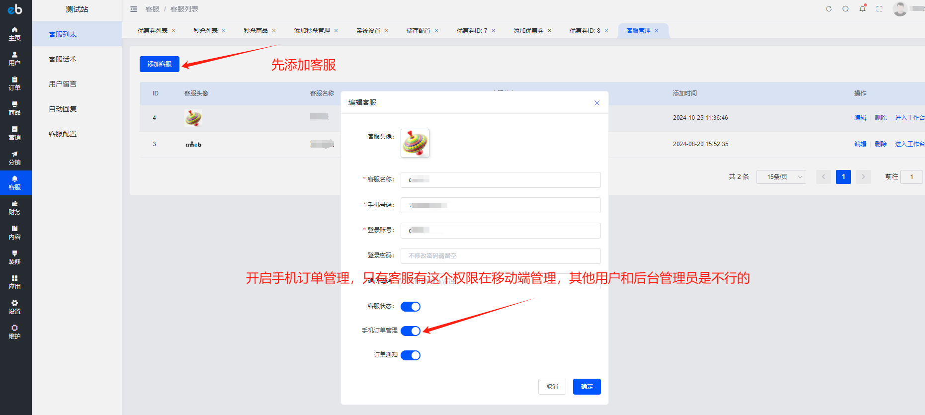 - 在CRMEB后台的【客服管理】模块中,添加客服人员账号。