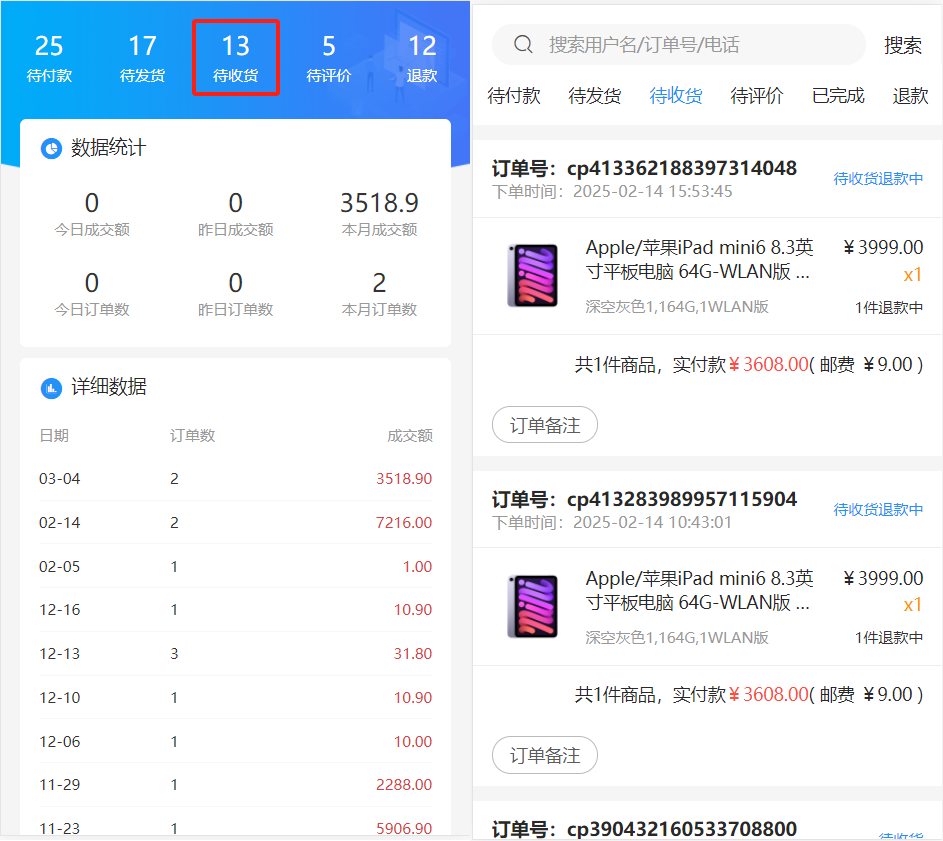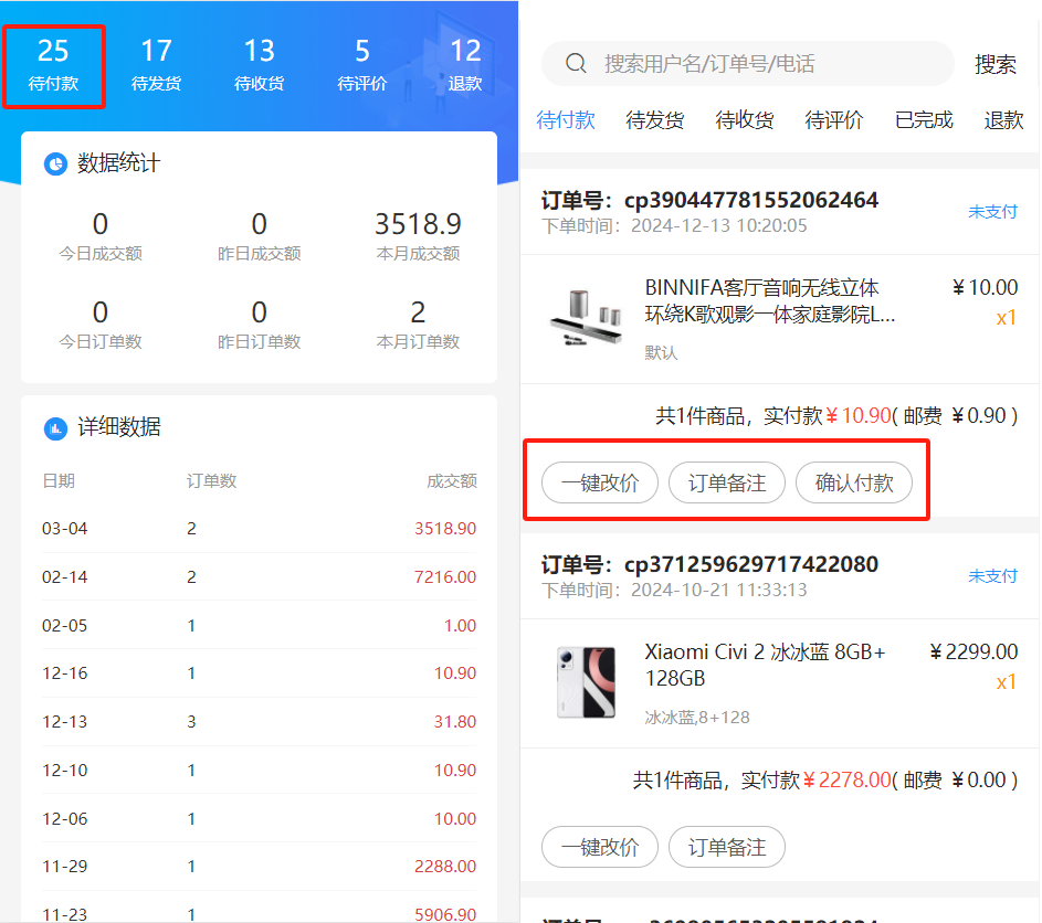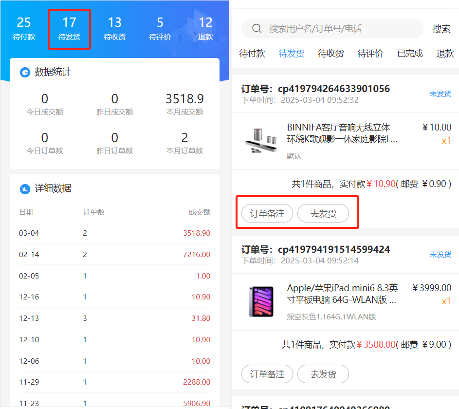 - 查看订单列表:按状态(待付款、待发货、已完成等)筛选订单。