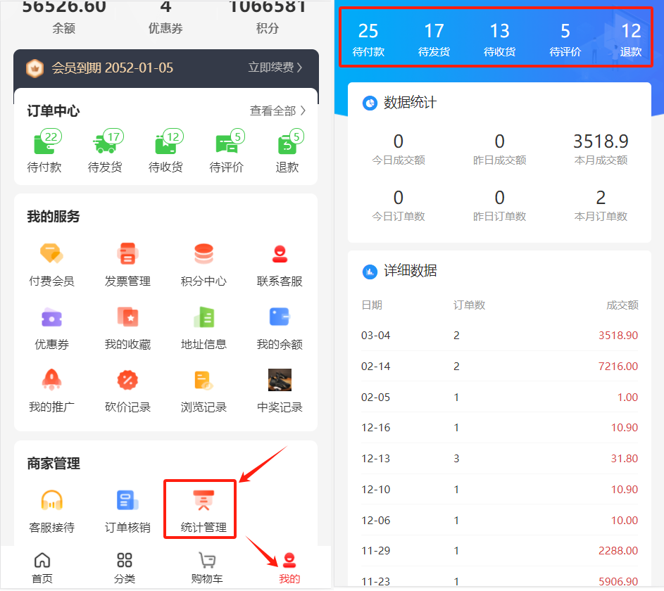- 进入【个人中心】→【统计管理】,即可看到"订单管理"相关入口。