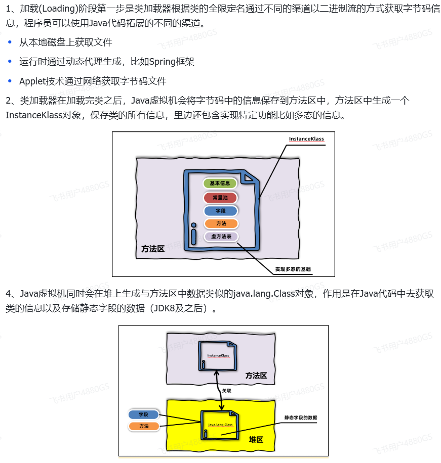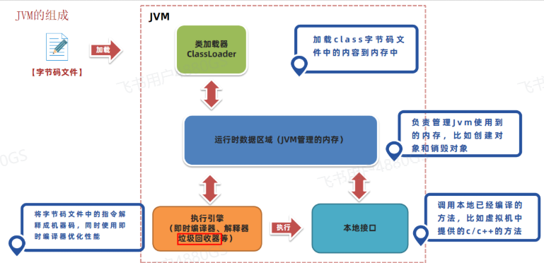 - 类加载子系统:核心组件类加载器,负责将字节码文件中的内容加载到内存中。