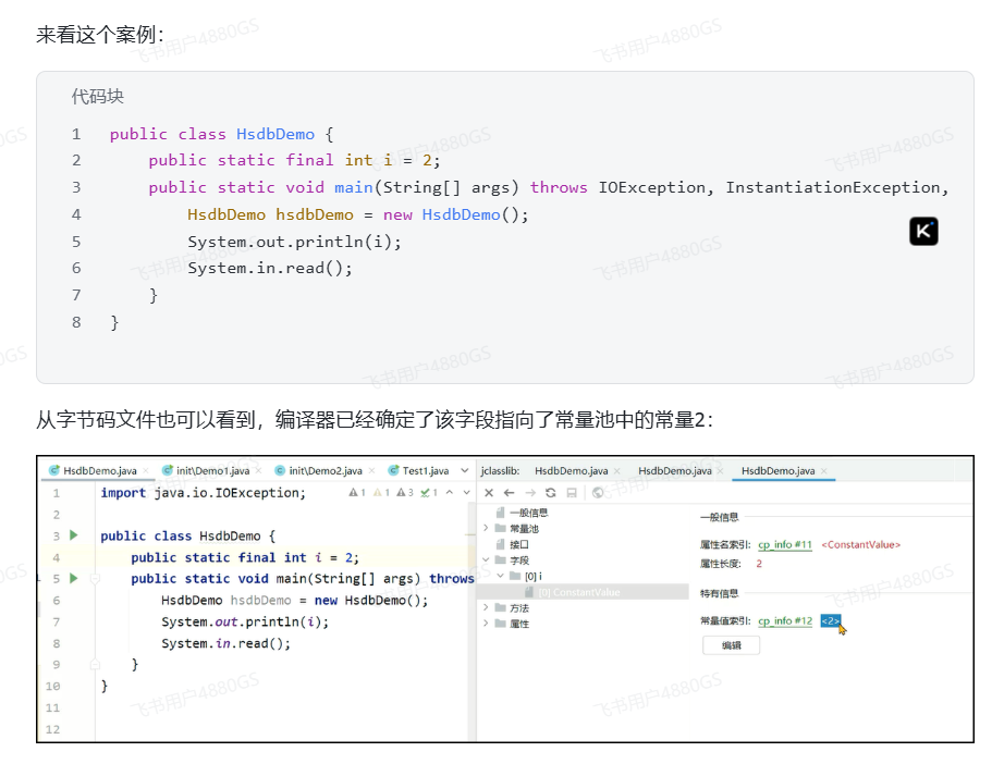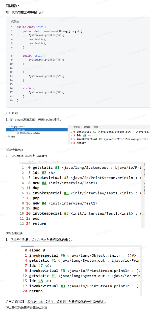 初始化阶段会执行字节码文件中clinit(class init 类的初始化)方法的字节码指令,包含了静态代码块中的代码,并为静态变量赋值。