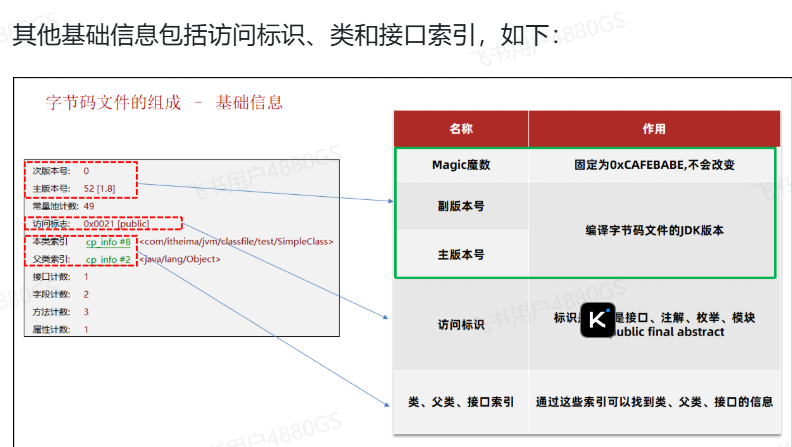 - 基础信息:魔数、字节码文件对应的Java版本号、访问标识(public final等等)、父类和接口信息