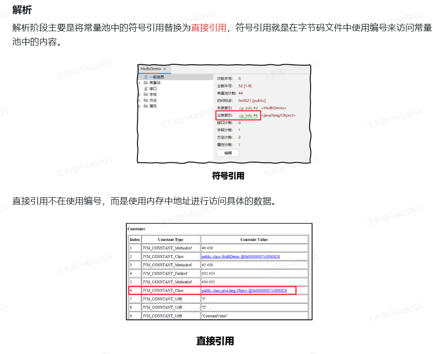 - 解析,将常量池中的符号引用替换成指向内存的直接引用。