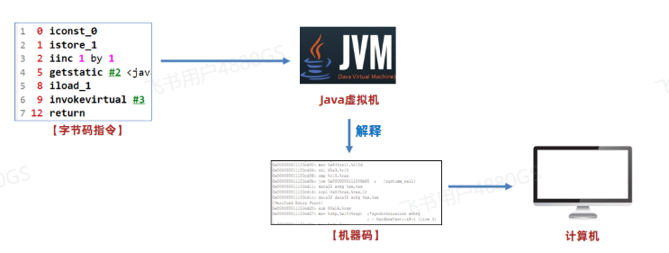 字节码文件中包含了字节码指令,计算器无法直接执行,Java虚拟机会将字节码文件中的字节码指令实时地解释成机器码,机器码是计算机可以运行的指令。