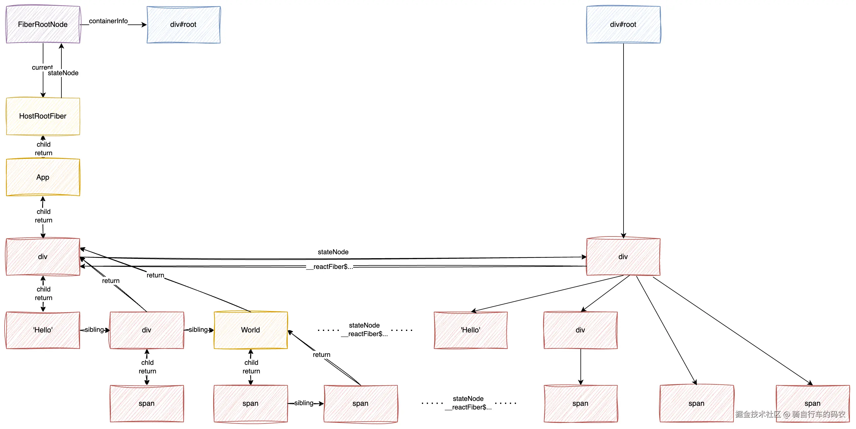 从左到右,为Fiber树,DOM树。Fiber树上,红色为真实DOM类型Fiber节点(HostComponent),黄色为其他类型Fiber。