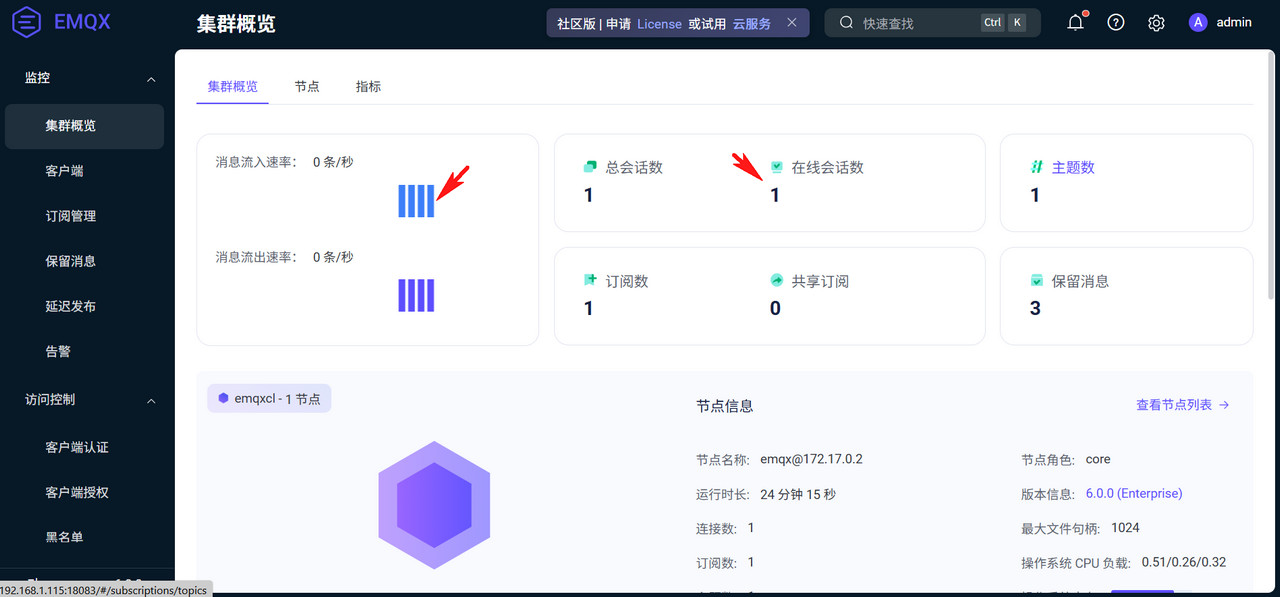- 在 EMQX 服务器后台可以看到消息的流入流出、在线会话数量、主题等信息