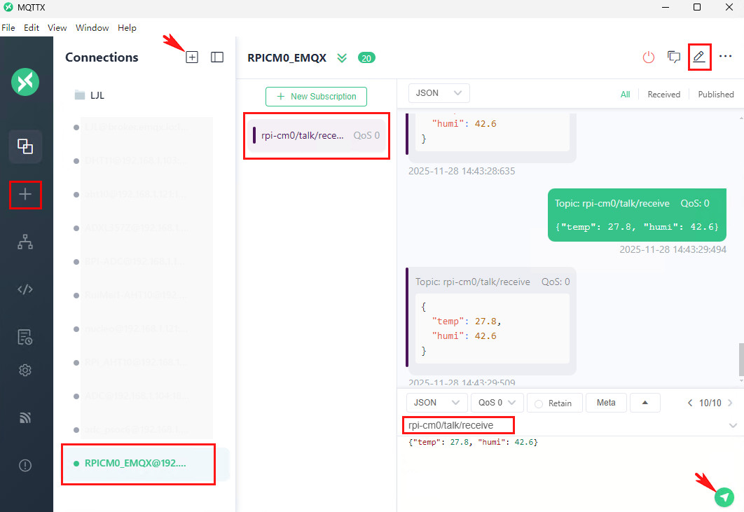 通过 MQTTX 软件向 EMQX 服务器发送消息,并订阅相同主题,实现消息接收。