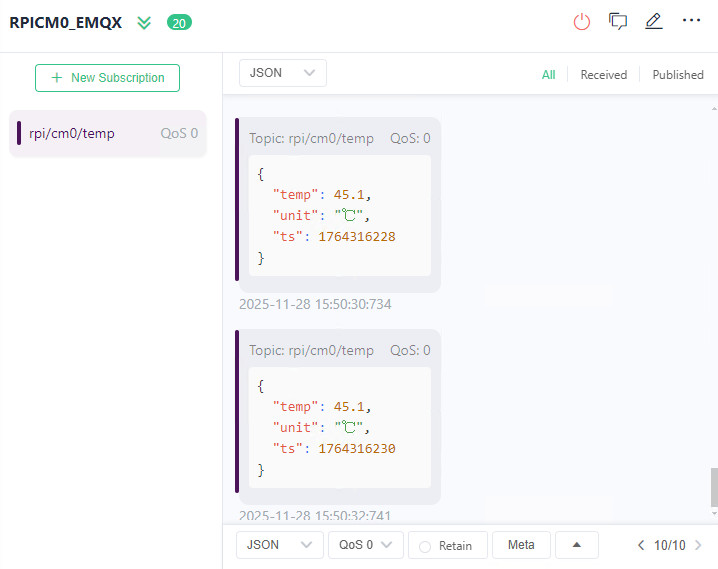 - 打开 MQTTX 软件,接收到 EMQX 服务器转发的 CM0 芯片温度信息