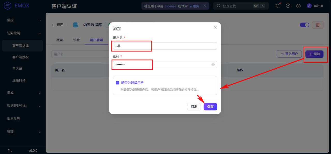 用户管理-新建用户- 自定义用户名和密码 - 保存.