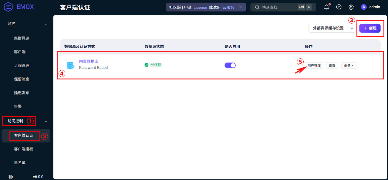 访问控制-客户端认证-创建-Password-Based-内置数据库- (默认配置)-创建;