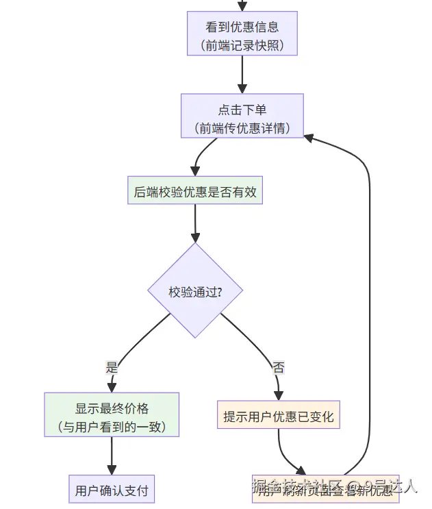 核心流程:用户看到优惠 → 下单时校验 → 优惠变化时提示用户