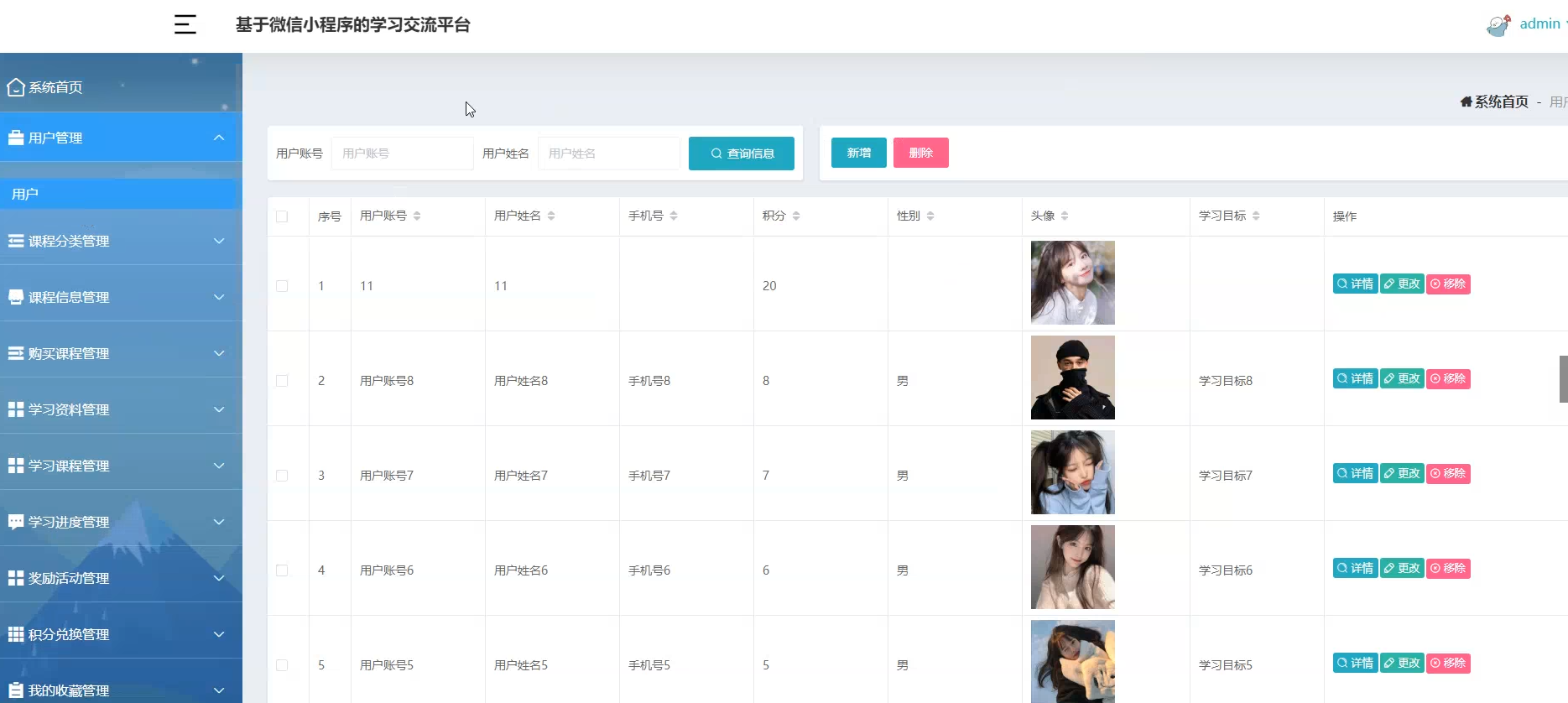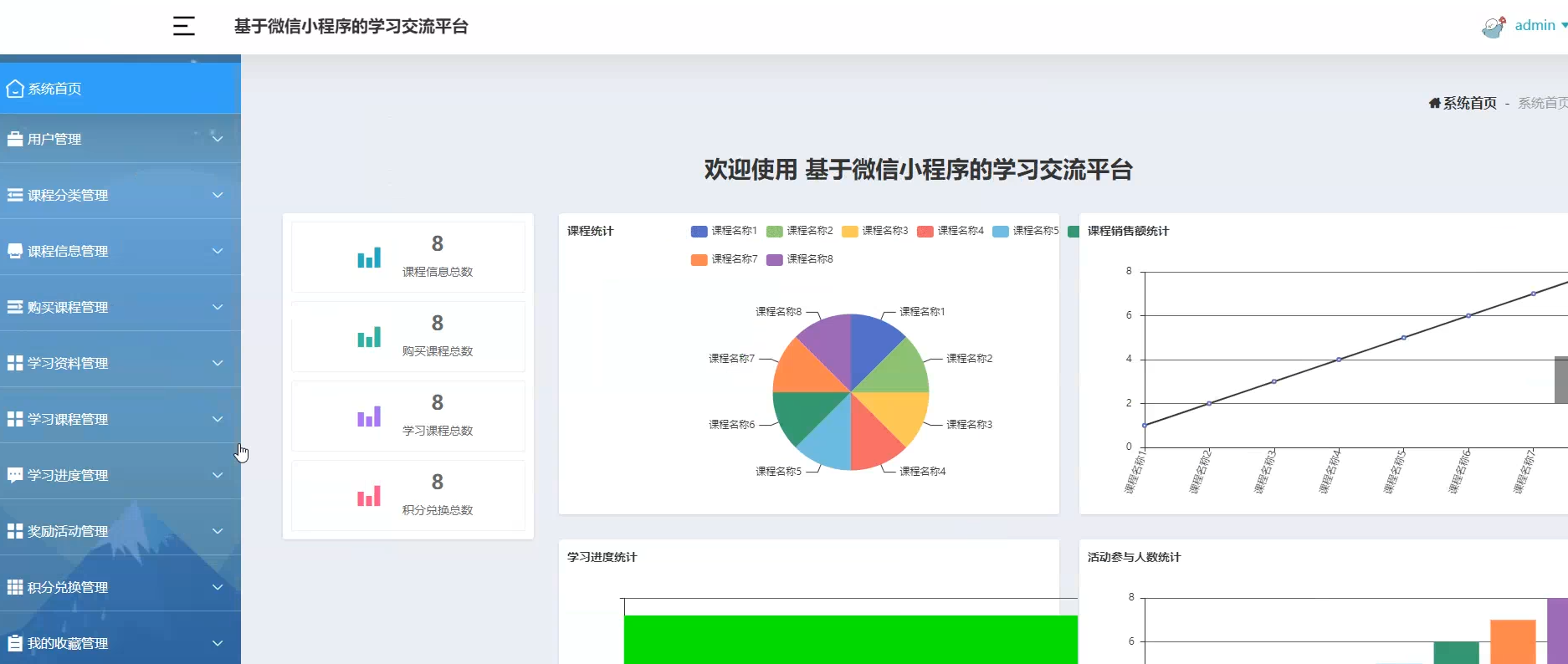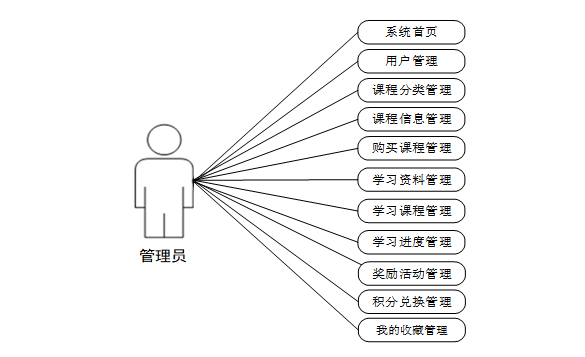 管理员进入系统主页面,主要功能包括对系统首页、用户管理、课程分类管理、课程信息管理、购买课程管理、学习资料管理、学习课程管理、学习进度管理、奖励活动管理、积分兑换管理、我的收藏管理等进行操作。如图5-8所示: