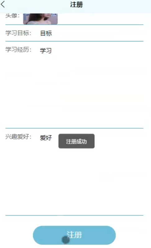 当用户进入微信小程序进行相关操作前必须先注册登录,在注册页面填写用户账号、密码、确认密码、用户姓名、头像、性别、手机号、学习目标等信息,然后点击注册,如图5-2所示。