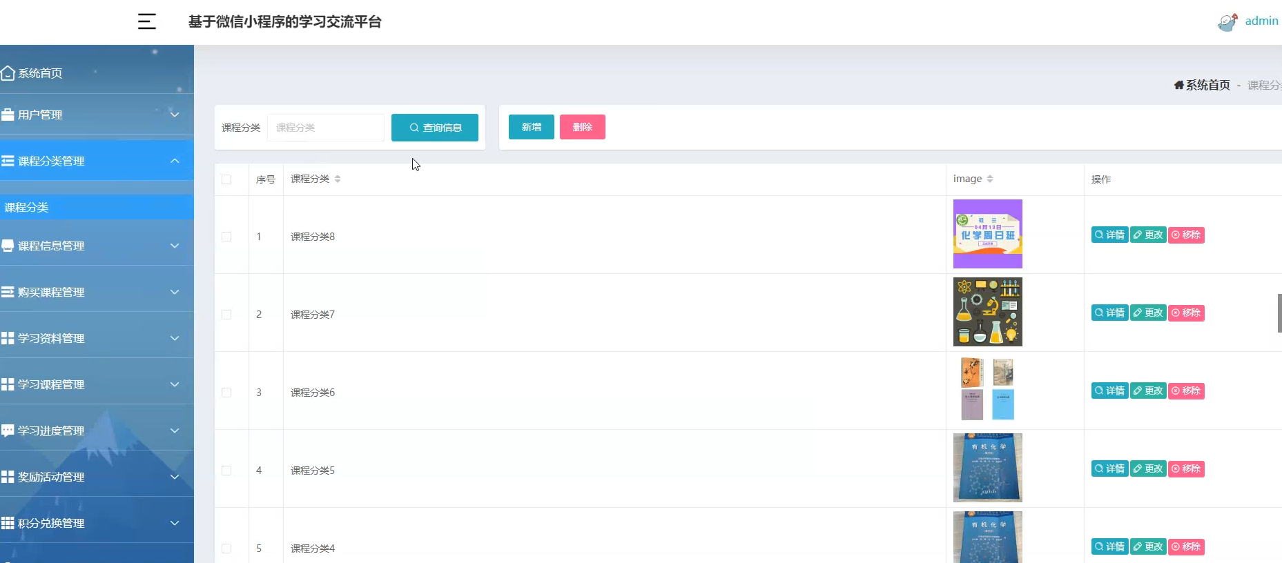 管理员点击课程分类管理,在课程分类管理页面的输入课程分类等信息,进行查询、新增或者删除课程分类等操作,如图5-11所示。