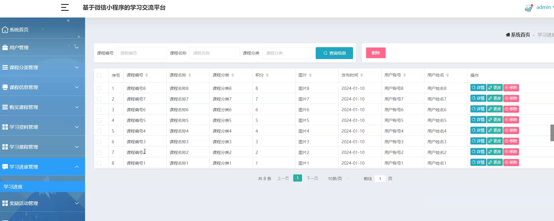 管理员点击学习进度管理,在学习进度管理页面的对课程编号、课程名称、课程分类、积分、图片、发布时间、用户账号、用户姓名等信息,进行查询或者删除学习进度等操作,如图5-15所示。