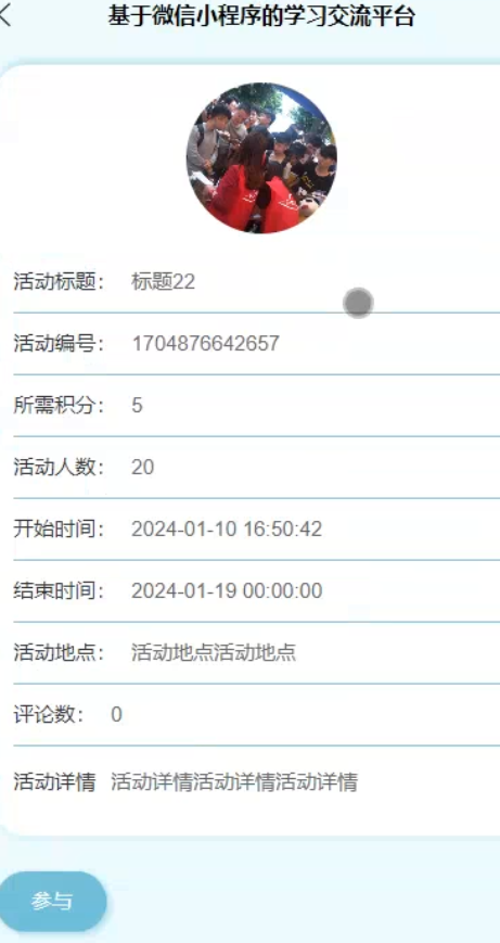 用户点击奖励活动,在奖励活动页面的搜索栏输入活动编号,进行搜索,然后可以查看活动编号、活动标题、封面、所需积分、活动人数、开始时间、结束时间、活动地点、评论数等信息,如有需要进行参与或者评论等操作,如图5-4所示。