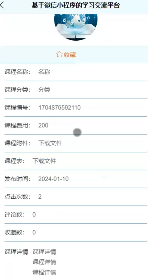 用户点击课程信息,在课程信息页面的搜索栏输入课程名称,进行搜索,然后可以查看课程编号、课程名称、课程分类、课程费用、课程封面、课程附件、课程表、发布时间等信息,如有需要点击购买或者收藏等操作,如图5-5所示。