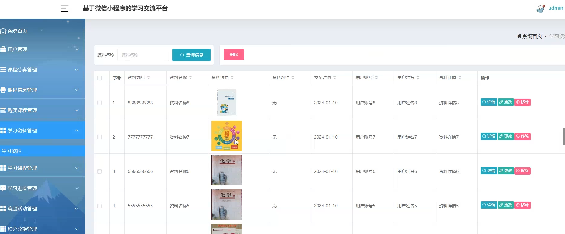 管理员点击学习资料管理,在学习资料管理页面的对资料编号、资料名称、资料封面、资料附件、发布时间、用户账号、用户姓名、资料详情等信息,进行查询或者删除学习资料等操作,如图5-14所示。
