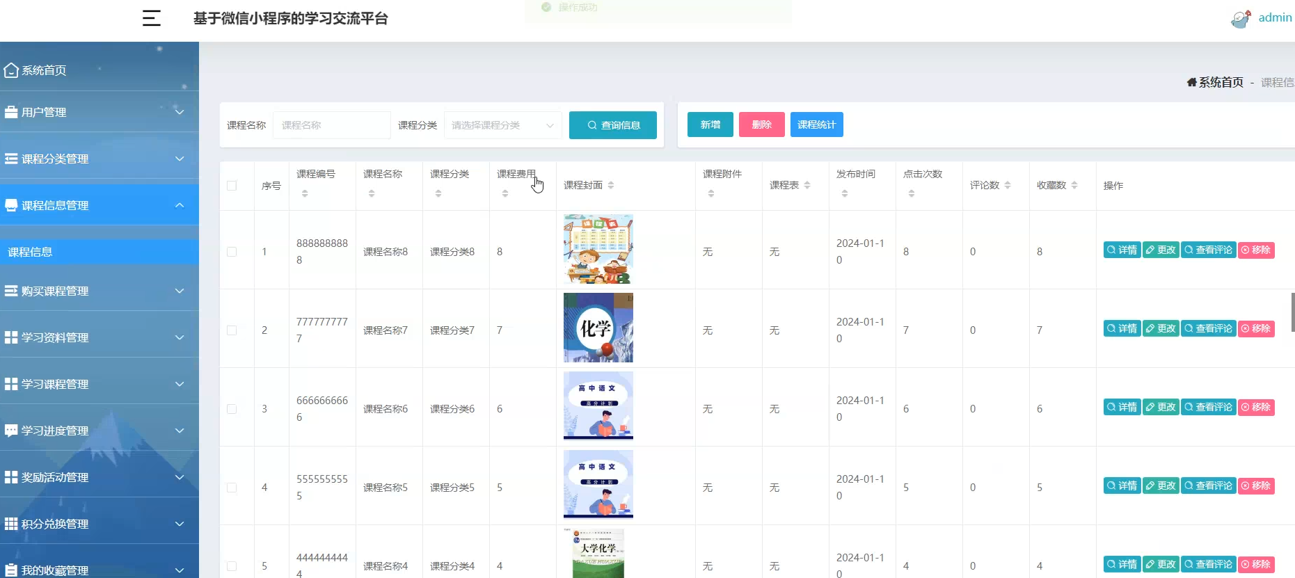 管理员点击课程信息管理,在课程信息管理页面的对课程编号、课程名称、课程分类、课程费用、课程封面、课程附件、课程表、发布时间、点击次数、评论数、收藏数等信息,进行查询、新增或者删除课程信息等操作,如图5-12所示。