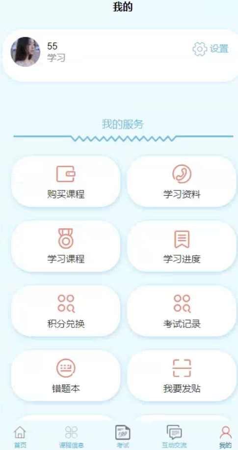 用户点击我的页面,在我的页面可以对购买课程、学习资料、学习课程、学习进度、积分兑换、考试记录、错题本、我要发帖、我的发帖、修改密码,进行详细操作,如图5-6所示。