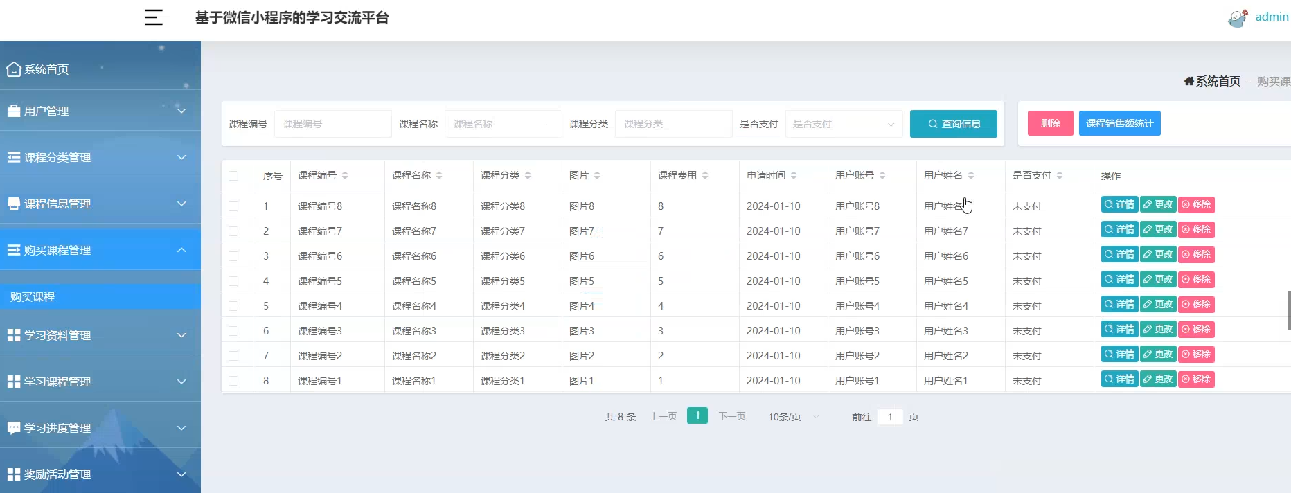 管理员点击购买课程管理,在购买课程管理页面的对课程编号、课程名称、课程分类、图片、课程费用、申请时间、用户账号、用户姓名、是否支付等信息,进行查询或者删除购买课程等操作,如图5-13所示。
