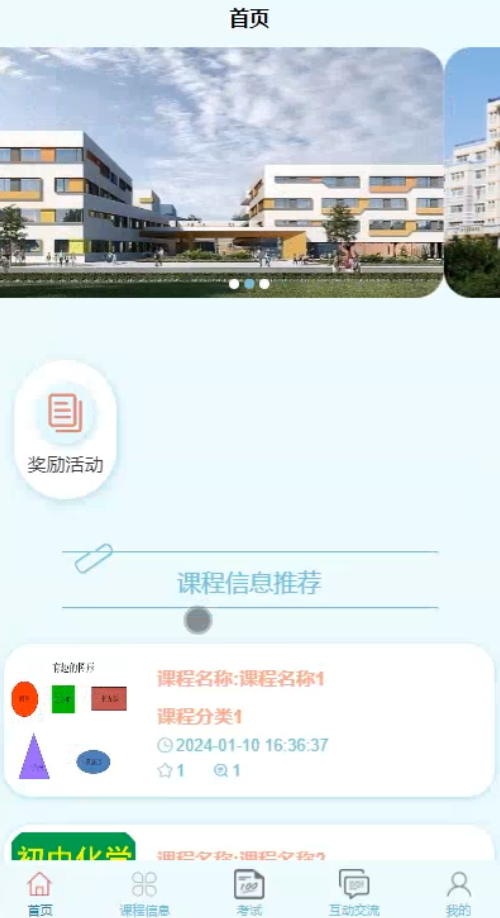 当游客打开微信小程序的网址后,首先看到的就是微信小程序首页界面。在这里,游客能够看到微信小程序的学习交流平台的导航条显示首页、课程信息、考试、互动交流、奖励活动、我的等,如图5-1所示。