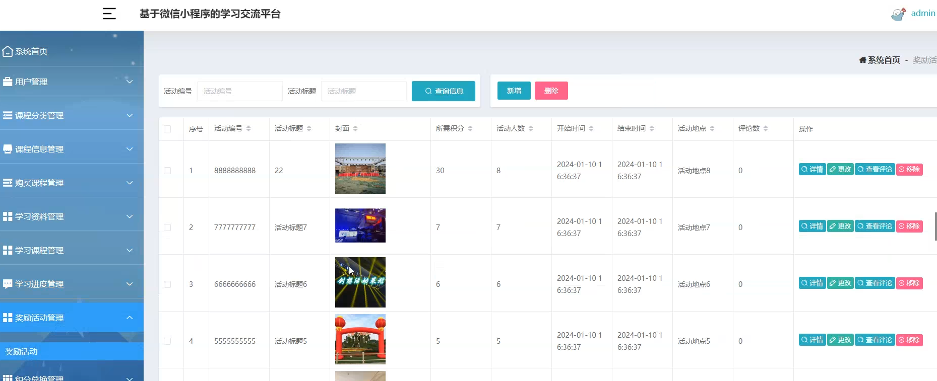 管理员点击奖励活动管理,在奖励活动管理页面的对活动编号、活动标题、封面、所需积分、活动人数、开始时间、结束时间、活动地点、评论数等信息,进行查询或者删除奖励活动等操作,如图5-16所示。