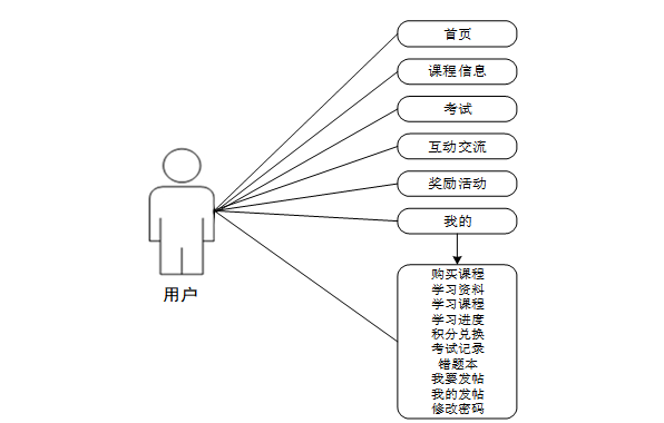 (1)、用户关键功能包含用户注册登陆、课程信息、考试、互动交流、奖励活动、我的等有关功能。用户用例如下:
