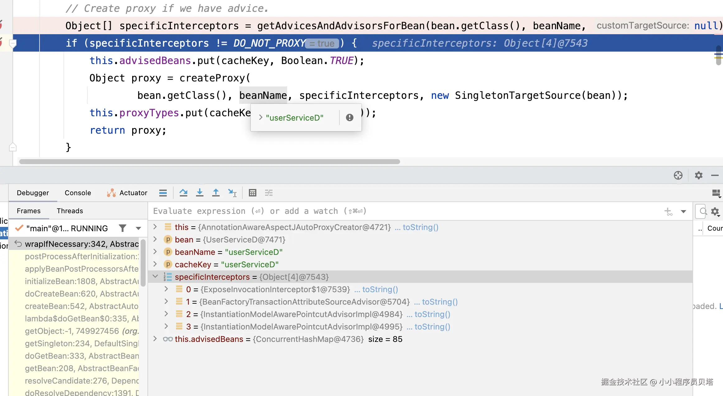 由于我们自定义的Bean(UserService) 上是有事务的注解的,以及有被自定义的aspect切面拦截,所以这里会返回4个Advosir, 见下图,第一个是Spring添加的Interceptor,第二个是用于处理事务的Interceptor ,后面两个是Aspect切面的两个前置通知方法解析而成的Advisor